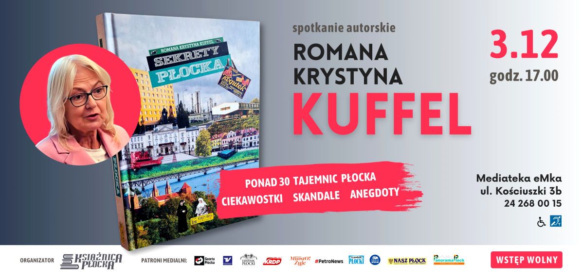 📅 3 grudnia 2025 (środa)🕔 godz. 17:00📍 Mediateka eMka Książnicy Płockiej (ul. Kościuszki 3b, tel. 24 262 00 87) 📖 O wydarzeniu Książnica Płocka zaprasza na spotkanie autorskie z Romaną Krystyną Kuffel oraz promocję książki „Sekrety Płocka”. – Autorka odkrywa ponad trzydzieści sekretów miasta– Zagląda do orbisowskiego hotelu Petropol– Podąża szlakiem mozaik– Ujawnia podwójne życie… Dowiedz się więcej »Spotkanie autorskie z Romaną Krystyną Kuffel