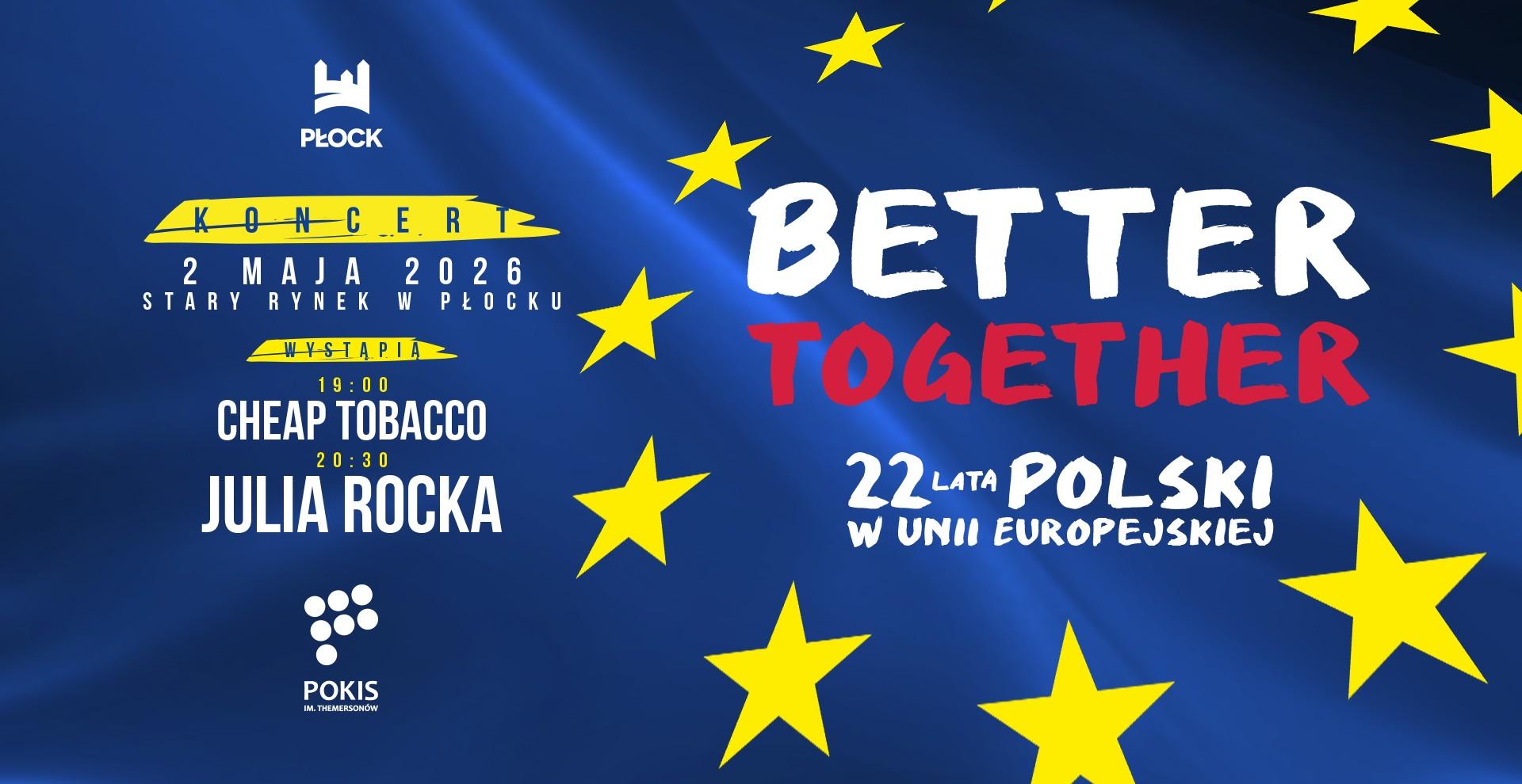 Z okazji 22. rocznicy przystąpienia Polski do Unii Europejskiej, Urząd Miasta Płocka oraz Płocki Ośrodek Kultury i Sztuki im. Themersonów serdecznie zapraszają na koncert plenerowy, który odbędzie się w sercu Starego Miasta, przed Ratuszem. 📅 Data: 2 maja 2026 roku (sobota) 📍 Miejsce: Rynek Starego Miasta w Płocku 🎟️ Wstęp: Wolny 🎶 Program koncertu: 19:00… Dowiedz się więcej »22 lata Polski w Unii Europejskiej – Koncert 🇪🇺