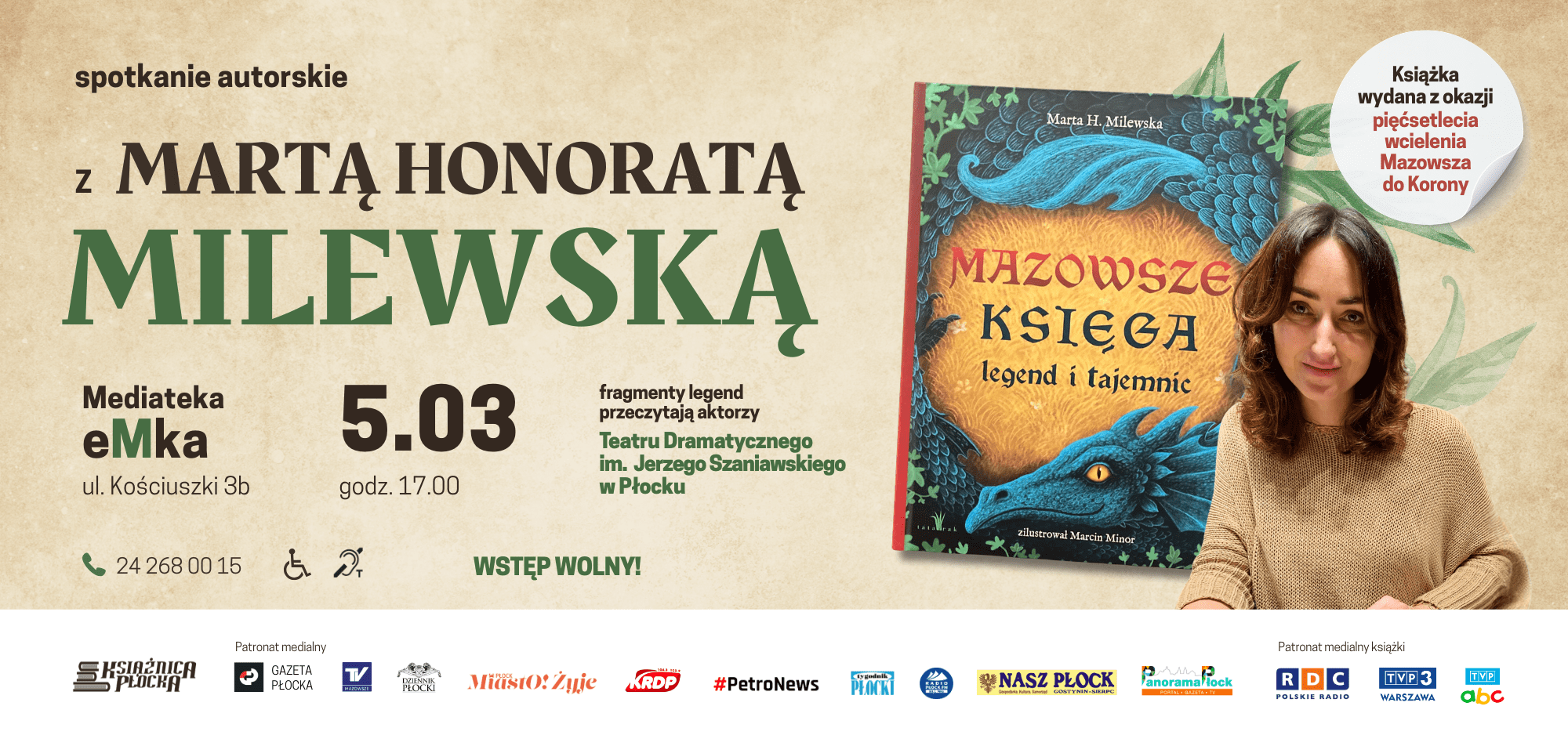 Mediateka "eMKa" Kościuszki 3B, Płock, Polska📅 Data: 5 marca 2026 (czwartek)⏰ Godzina: 17:00📍 Miejsce: Mediateka eMka, Książnica Płocka, ul. Kościuszki 3b, Płock🎟️ Wstęp: Wolny Książnica Płocka zaprasza na spotkanie z Martą Honoratą Milewską – medioznawczynią,… Dowiedz się więcej »Spotkanie autorskie z Martą Honoratą Milewską