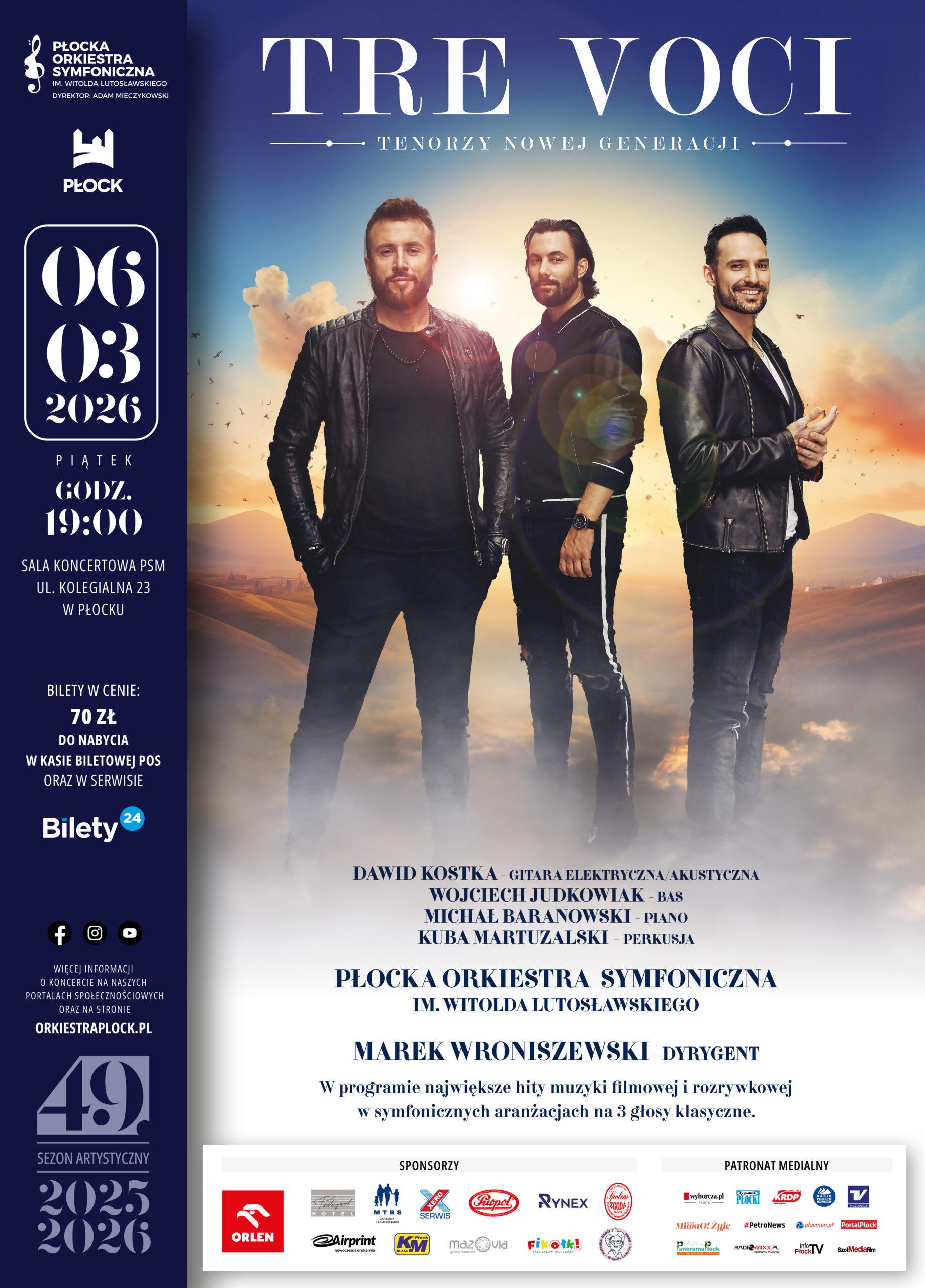 6 marca 2026, godz. 19:00, sala koncertowa PSM, ul. Kolegialna 23 TRE VOCI Wykonawcy: Tre Voci: Voytek Soko Sokolnicki – tenor Mikołaj Adamczak – tenor Miłosz Gałaj – tenor Dawid Kostka – gitara elektryczna/akustyczna Wojciech Judkowiak – bas Michał Baranowski – piano Kuba Martuzalski – perkusja Płocka Orkiestra Symfoniczna im. Witolda Lutosławskiego Marek Wroniszewski –… Dowiedz się więcej »TRE VOCI