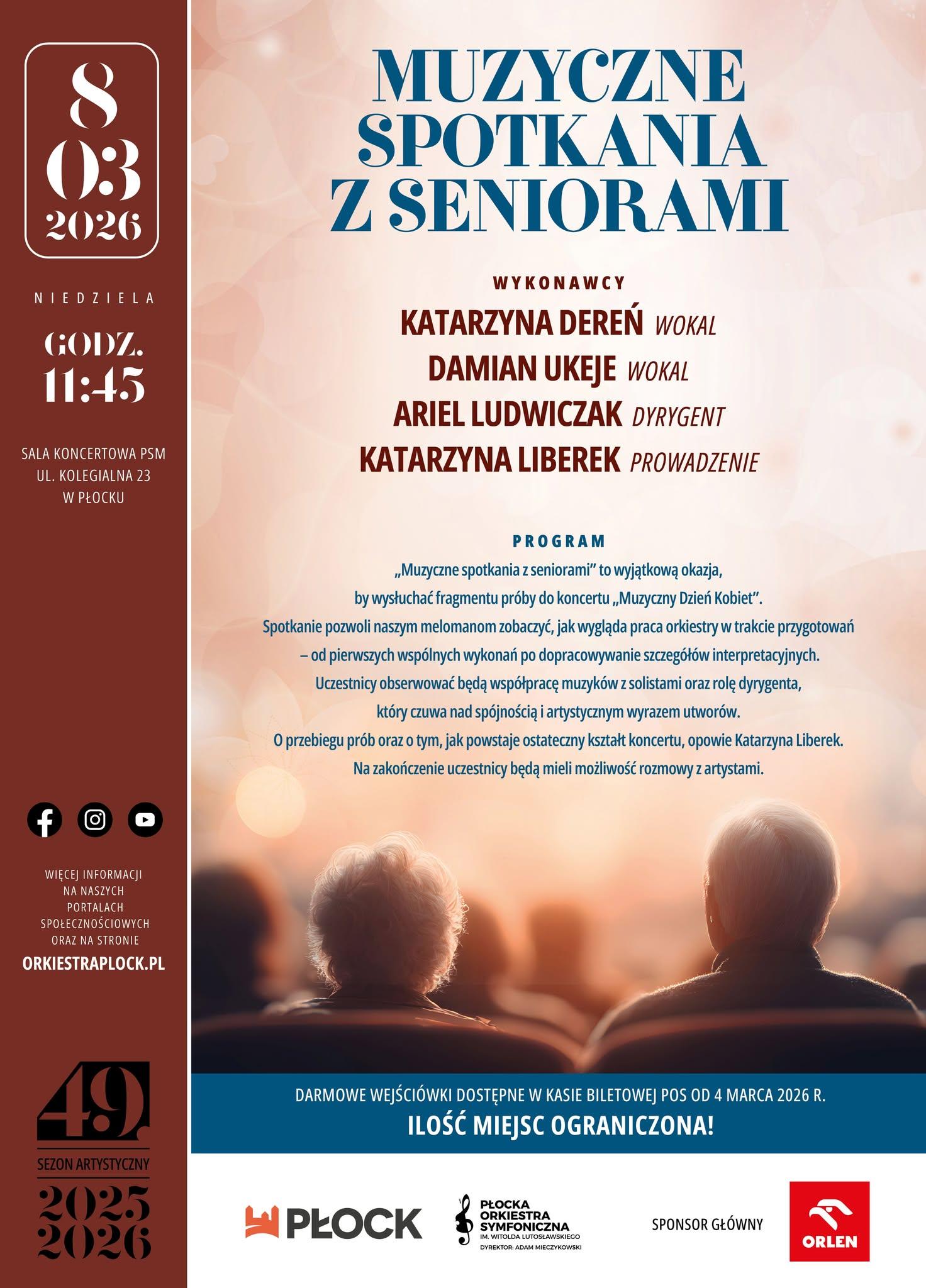 8 marca 2026, godz. 11:45, sala koncertowa PSM, ul. Kolegialna 23 MUZYCZNE SPOTKANIA Z SENIORAMI Wykonawcy: Katarzyna Dereń – wokal Damian Ukeje – wokal Ariel Ludwiczak – dyrygent Katarzyna Liberek – prowadzenie Program: - wysłuchanie fragmentu próby do koncertu „Muzyczny Dzień Kobiet” - omówienie przebiegu pracy Orkiestry z solistami i dyrygentem podczas prób przez Katarzynę… Dowiedz się więcej »MUZYCZNE SPOTKANIA Z SENIORAMI